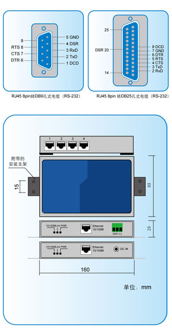 ZJTS808 | 1个10M/100M网口,8口RS-232串口通讯服务器,15KVESD保护 |