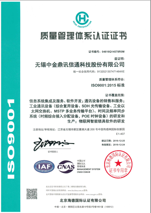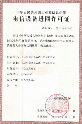 中金鼎讯综合复用设备(PCM)在经历了长达一个月的专业测试后,于2014年4月成功通过工信部电信设备进网专业检测并获得工信部颁发的《电信设备进网许可证》(许可证编号:2B-B198-141167)